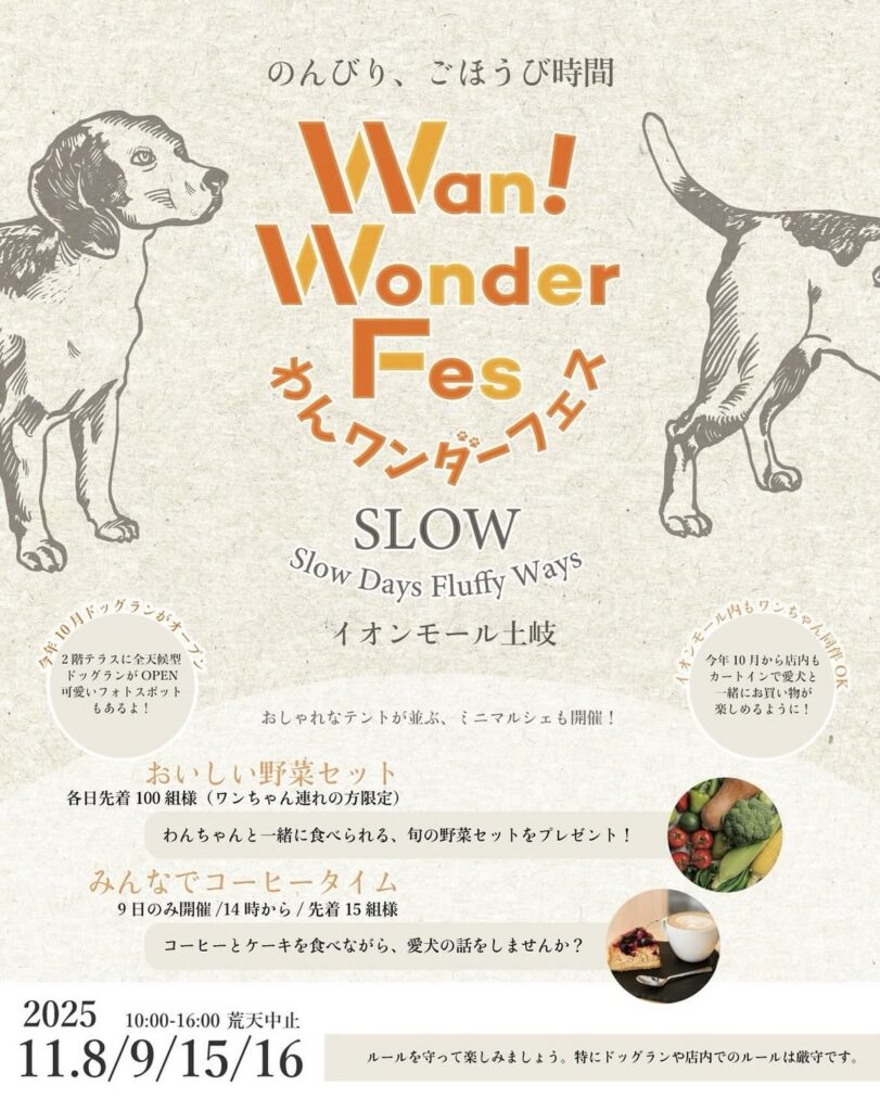 Screenshot わんワンダーフェス SLOW イオンモール土岐に出店します。 11月8日(土)9日(日)と、15日(土)16日(日)の二週に渡り、イオンモール土岐で開催されるNPO法人KIMIMO主催のわんワンダーフェスのミニマルシェに出店いたします。 Screenshot 投稿公開日:25.11.05 投稿カテゴリー:NEWS その他の記事を読む 前の投稿いのちの絵本コンサート ワークショップ実施しました。 次の投稿わんワンダーフェスSLOW イオンモール土岐 に出店しました。 おすすめ わんワンダーフェス イオンモール土岐に展示します。 25.08.03 わんワンダーフェス イオンモール須坂 に出店します。 25.11.17 第100回 東京インターナショナル・ギフト・ショー LIFE×DESIGN に出展しました。 25.09.07
