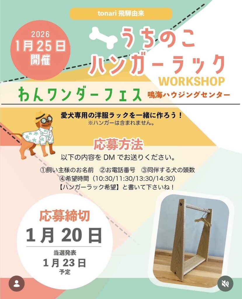 Screenshot わんワンダーフェス 鳴海ハウジングセンターに出店 & ワークショップ実施いたします。 2026年1月25日(日)、鳴海ハウジングセンター(愛知県名古屋市)で開催されるNPO法人KIMIMO主催のわんワンダーフェスに出店いたします。お近くの方は是非お立ち寄りください。 また、当日は ワークショップも実施いたします。「うちの子ハンガーラックつくり」を予定しています。詳しくはNPO法人KIMIMOのWebサイトまたはInstagramをご確認ください。 Screenshot 投稿公開日:26.01.22 投稿カテゴリー:NEWS その他の記事を読む 前の投稿わんワンダーフェス AICHI SKY EXPOに出店&ワークショップ実施 します。 おすすめ モニター募集について 25.01.25 【10月11•12日】わんワンダーフェス イオンモール土岐に展示します。 25.09.07 東京インターナショナル・ギフト・ショー秋2025 第18回LIFE×DESIGN に出展します。 25.07.29